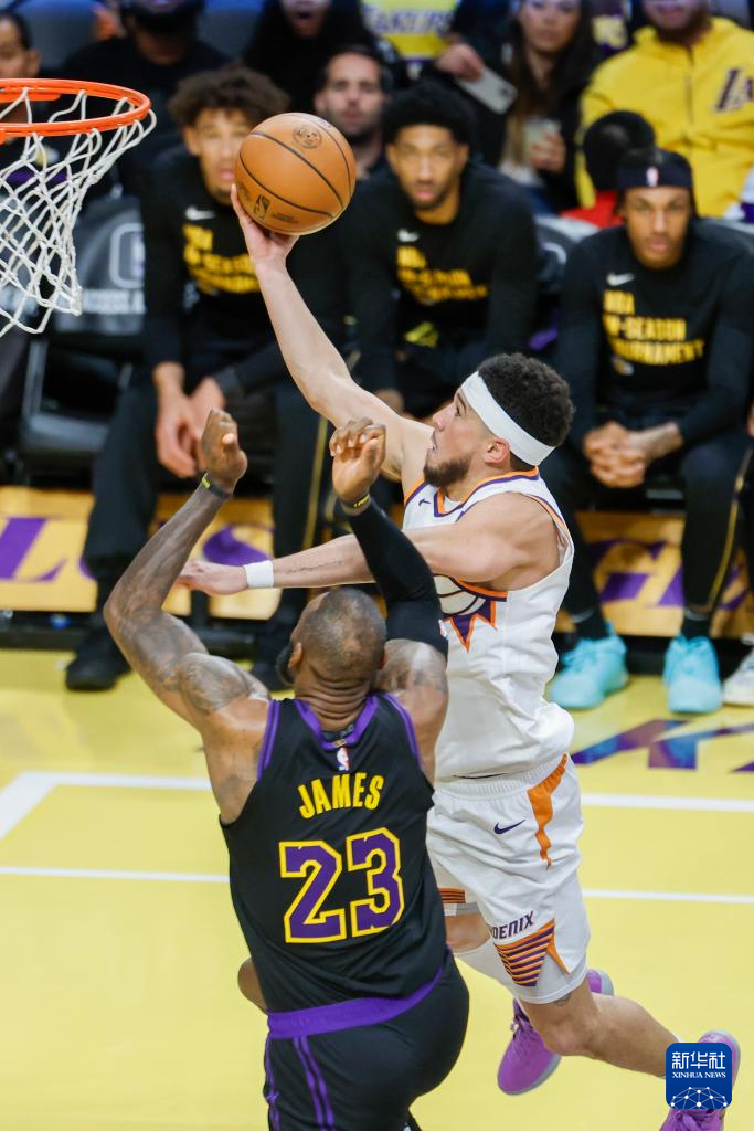 12月5日,太阳队球员德文·布克 (右)在湖人队球员勒布朗·詹姆斯的防守下上篮。新华社发(赵汉荣摄)