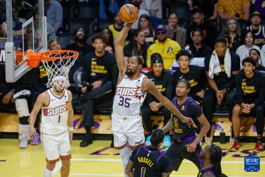 12月5日,太阳队球员凯文·杜兰特 (左二) 在比赛中扣篮。新华社发(赵汉荣摄)