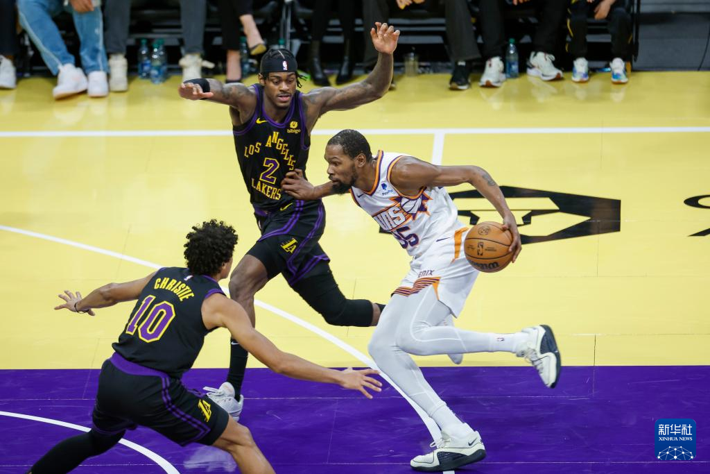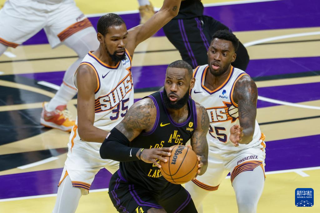 12月5日,太阳队球员凯文·杜兰特 (左)与队友纳西尔·利特尔(右)在比赛中防守湖人队球员勒布朗·詹姆斯的进攻。新华社发(赵汉荣摄)