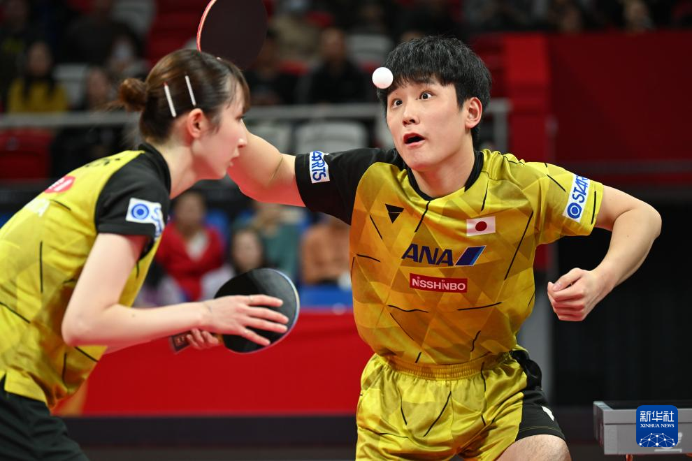12月6日,日本队选手张本智和(右)/早田希娜在混双比赛中发球。他们以3比0战胜中国台北队选手陈映蓁/王晨又。新华社记者 胥冰洁 摄
