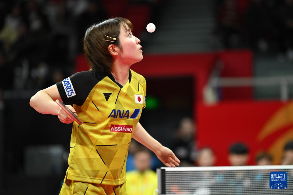 12月6日,日本队选手平野美宇在女单比赛中发球。她以3比0战胜中国台北队选手李昱谆。新华社记者 胥冰洁 摄