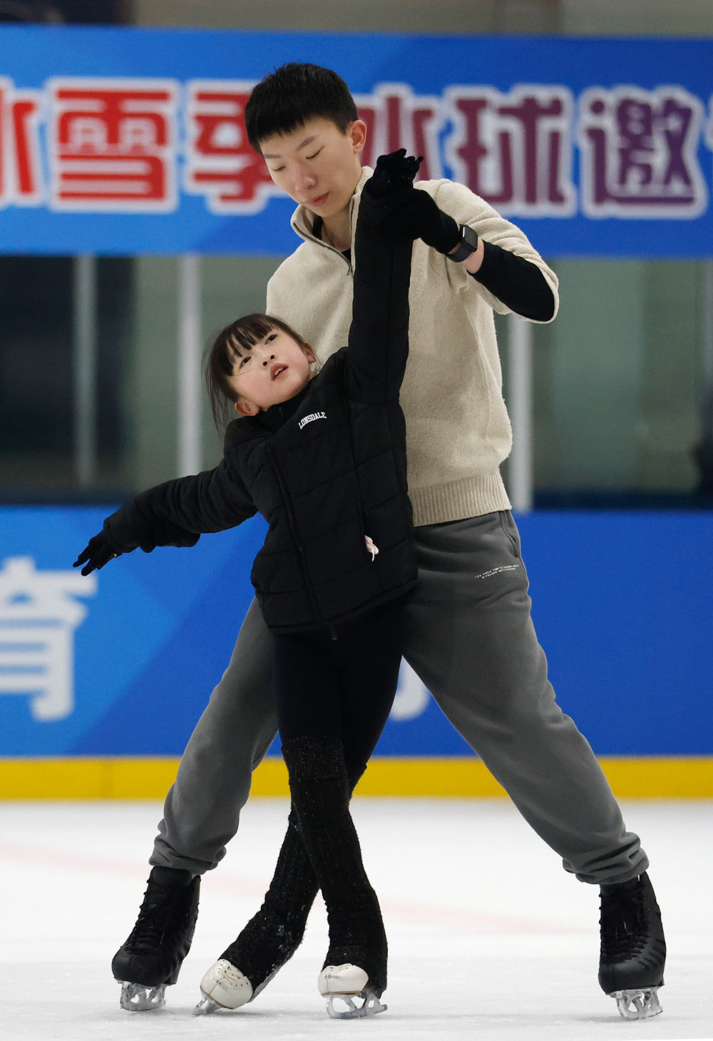1月15日,教练员杨曦(右)在冰上训练中为8岁的小学员郑诗琪指导花样滑冰技术动作。 新华社记者 张晨 摄