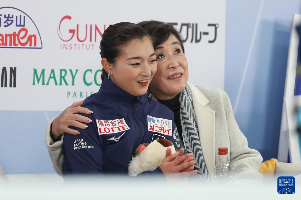 12月8日,日本选手坂本花织(左)与教练中野园子在比赛后等待成绩。她以77.35分暂列第一。