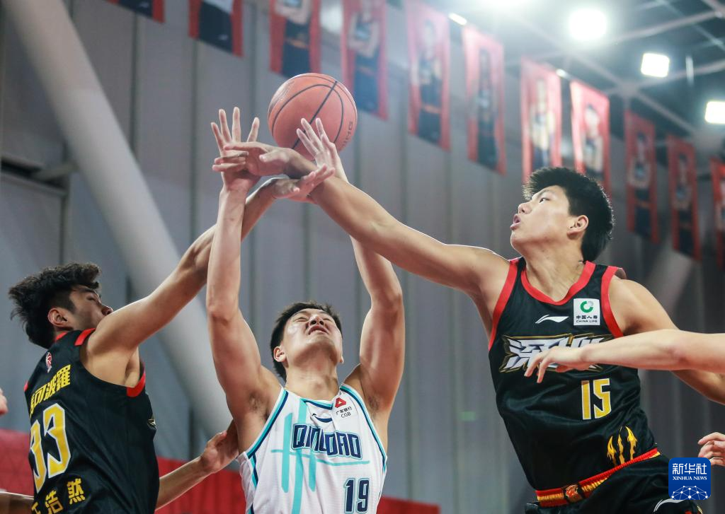 12月9日,深圳马可波罗队球员胡小龙(右)、王浩然(左)在比赛中与青岛国信水产队球员区俊炫争抢篮板。新华社发(彭志刚摄)