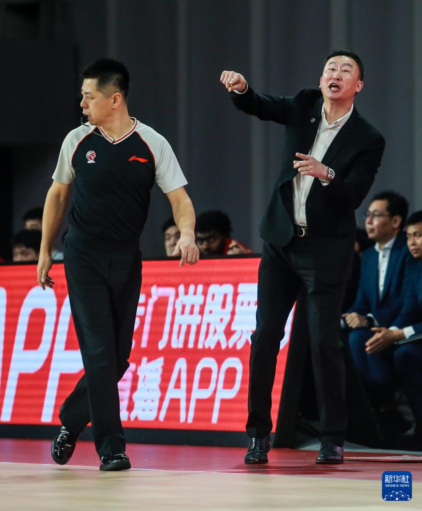 12月9日,青岛国信水产队主教练刘维伟(右)在场边指导。新华社发(彭志刚摄)