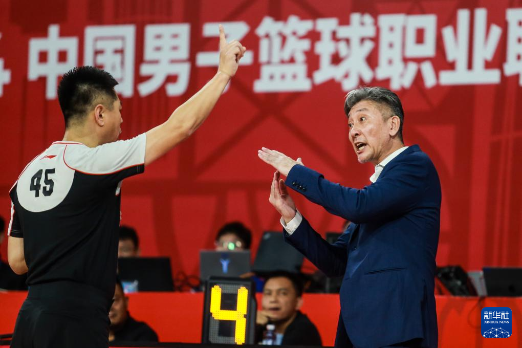 12月9日,深圳马可波罗队主教练郑永刚(右)在比赛中与裁判交流。新华社发(彭志刚摄)