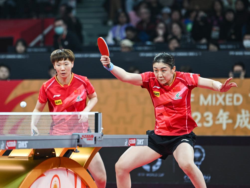 12月9日,中国队组合王曼昱/陈梦(右)在女双比赛中。新华社记者 王曦 摄