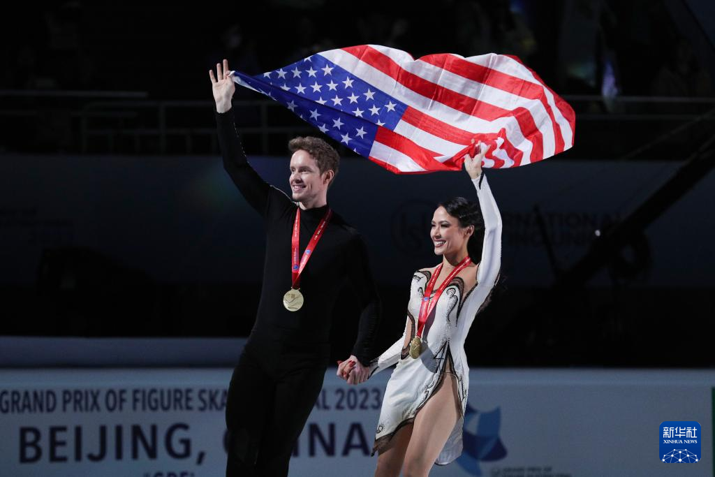 12月9日,冠军美国组合乔克(右)/贝茨在冰舞颁奖仪式后庆祝。新华社记者 许雅楠 摄