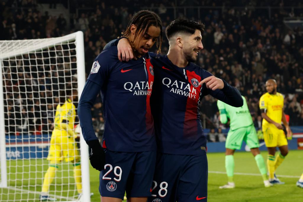 12月9日,巴黎圣日耳曼队球员巴尔科拉(左)进球后与队友索莱尔庆祝。新华社发(里特·埃斯摄)