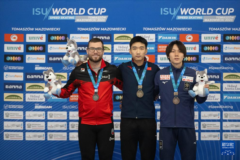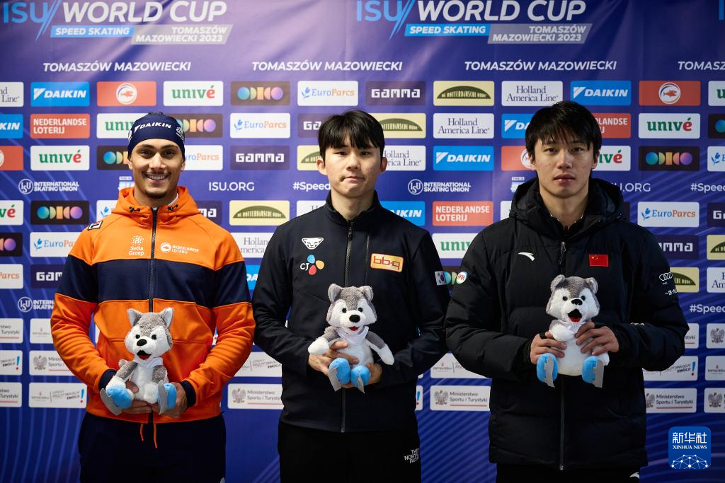 12月9日,中国选手都浩楠(右)、韩国选手车旼奎(中)与荷兰选手塞巴斯蒂安·迪尼兹在男子500米B组第一次比赛颁奖仪式上。新华社发(拉法尔摄)