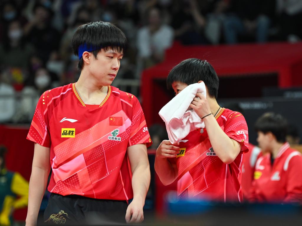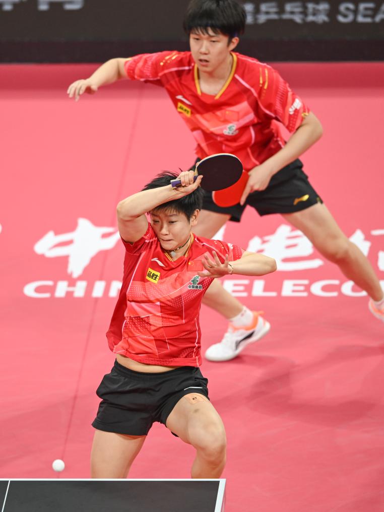 12月10日,王楚钦/孙颖莎(下)在混双比赛中。新华社记者 王曦 摄