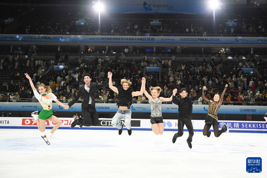 12月10日,格鲁吉亚组合梅特尔基纳/别鲁拉瓦、美国组合马尔克洛夫/内塞特、日本选手中田璃士和岛田麻央(从左至右)在表演滑结束后合影。新华社记者 鞠焕宗 摄
