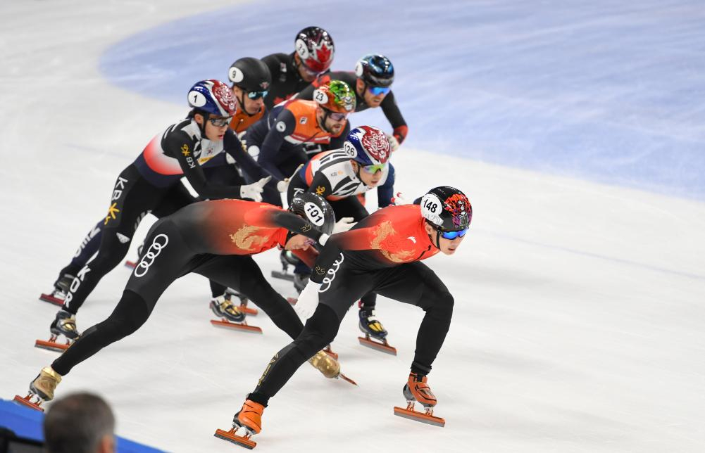 12月10日,中国选手任子威(前右一)和刘少林在比赛中接力。中国队获得男子5000米接力季军。新华社记者 陈钟昊 摄