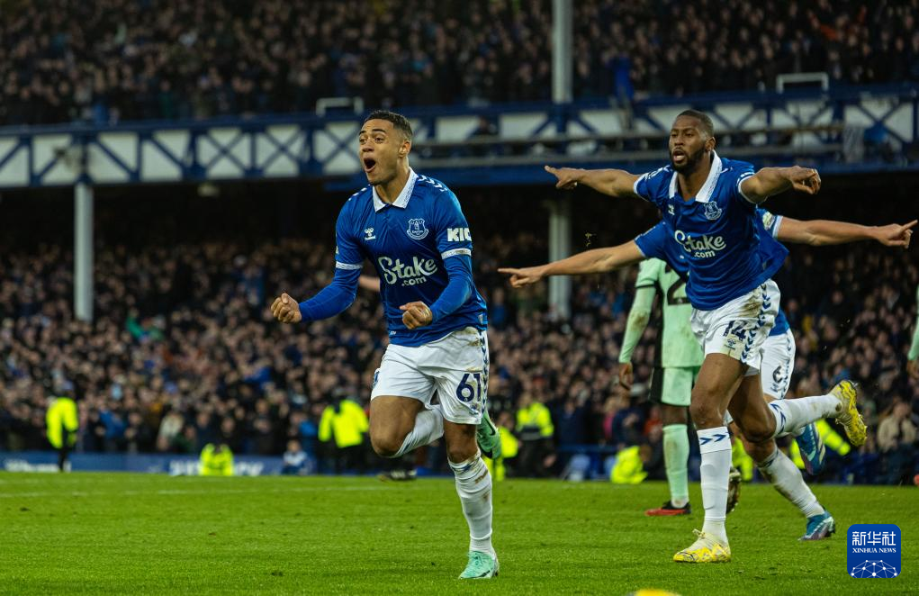 12月10日,埃弗顿队球员庆祝进球。新华社发