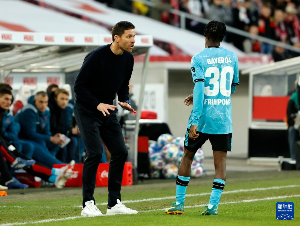 12月10日,勒沃库森队主教练阿隆索(左)在场边指导球员弗林蓬。新华社发(菲利普·鲁伊兹摄)