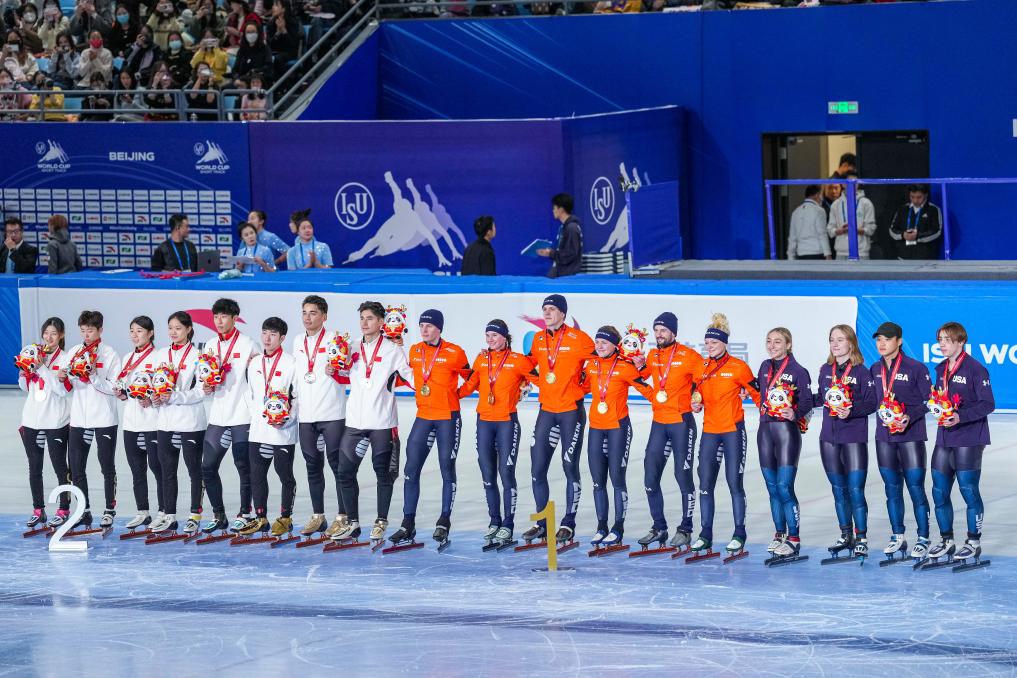 12月9日,2000米混合接力冠军荷兰队(中)、亚军中国队(左)和季军美国队在颁奖仪式上合影。新华社记者 孙非 摄