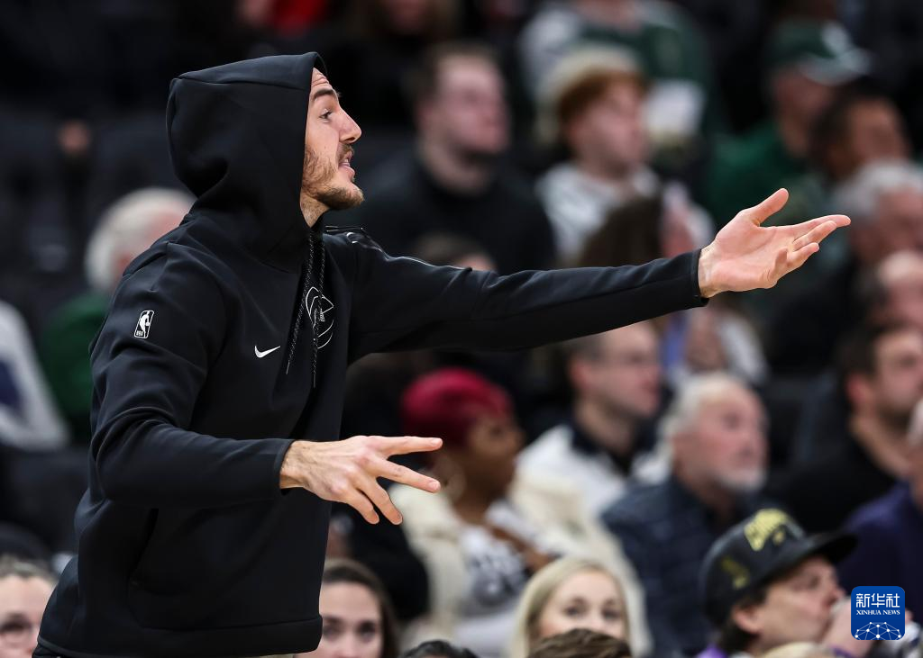 12月11日,公牛队球员卡鲁索在场边与队友交流。新华社发(乔尔·莱纳摄)