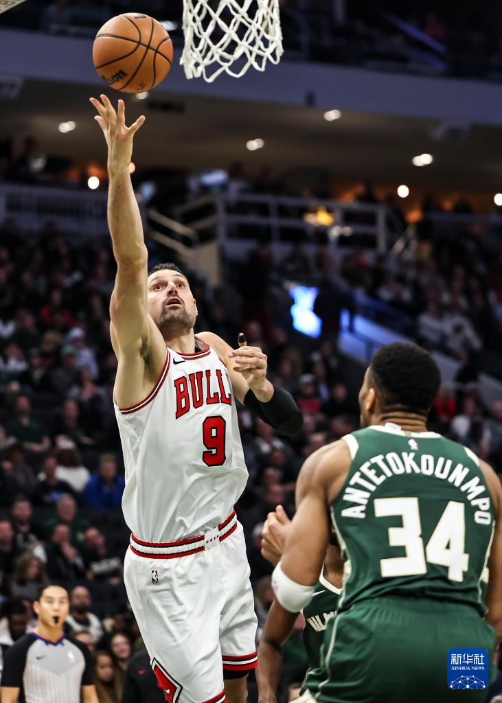 12月11日,公牛队球员武切维奇(左)在比赛中上篮。新华社发(乔尔·莱纳摄)