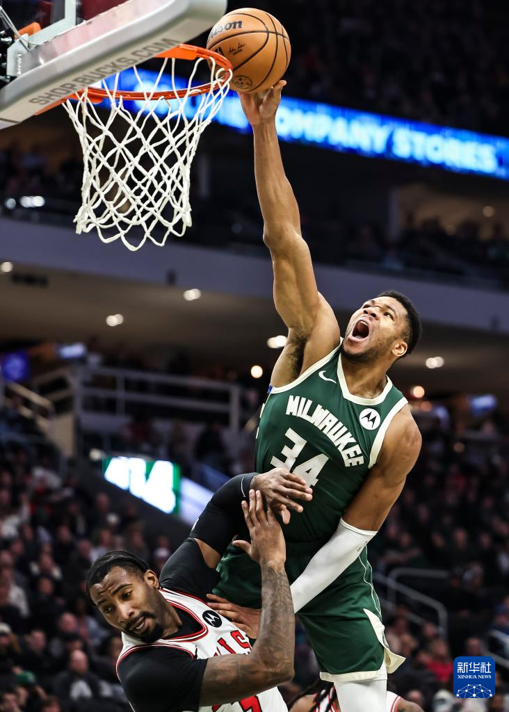 12月11日,雄鹿队球员安特托昆博(上)在比赛中扣篮。新华社发(乔尔·莱纳摄)