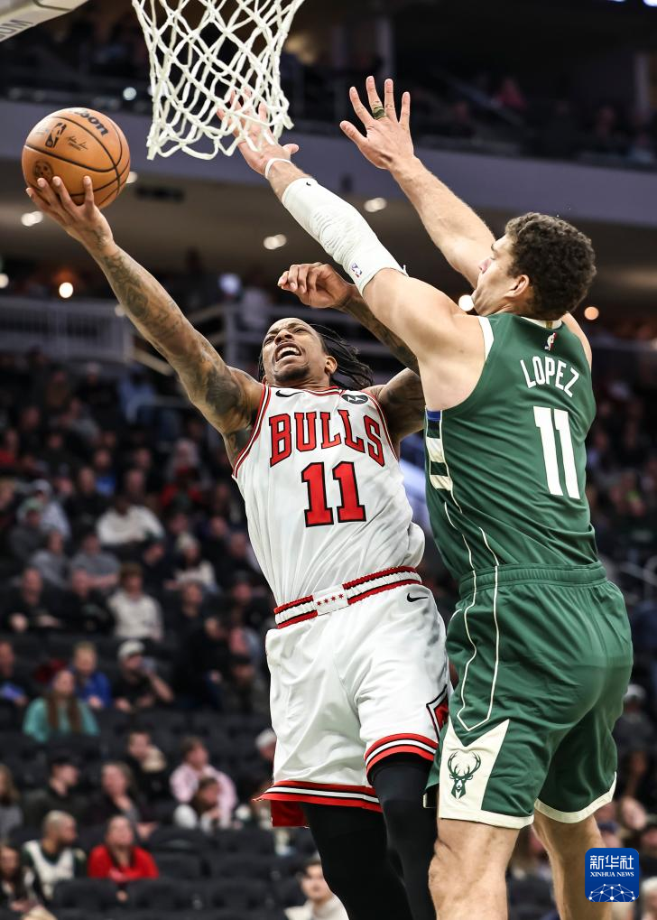 12月11日,公牛队球员德罗赞(左)在比赛中上篮。新华社发(乔尔·莱纳摄)
