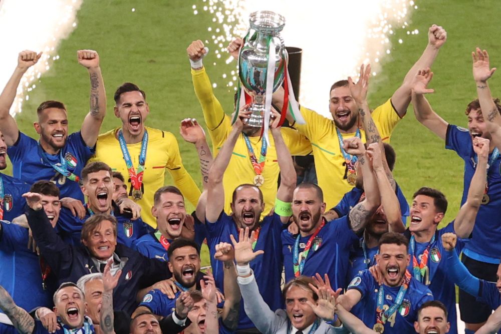 2021年7月11日,意大利队在颁奖仪式上捧杯庆祝。新华社/法新