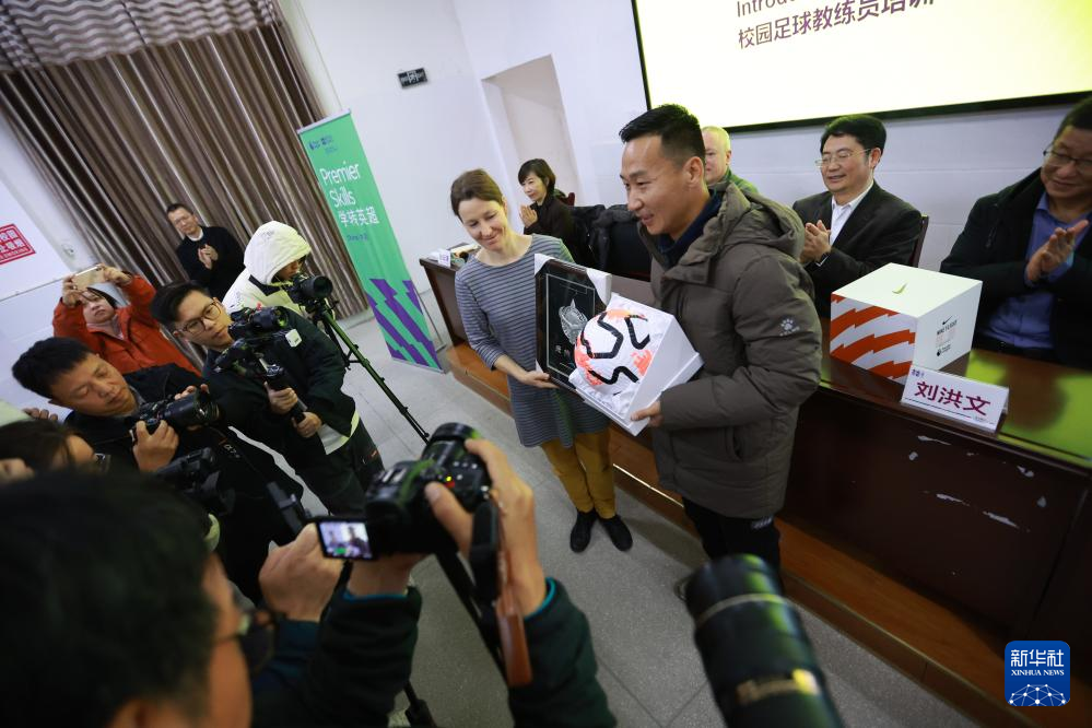12月12日,在“学转英超”基层足球教练培训项目开班仪式上,“村超”代表和英超代表交换礼物。新华社记者 刘续 摄