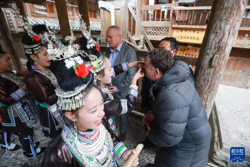 12月11日,榕江县少数民族同胞用迎门酒欢迎“学转英超”培训团队。新华社记者 刘续 摄
