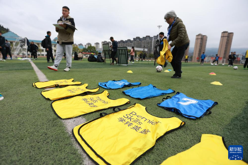 12月12日,“学转英超”基层足球教练培训项目工作人员整理训练背心。新华社记者 刘续 摄