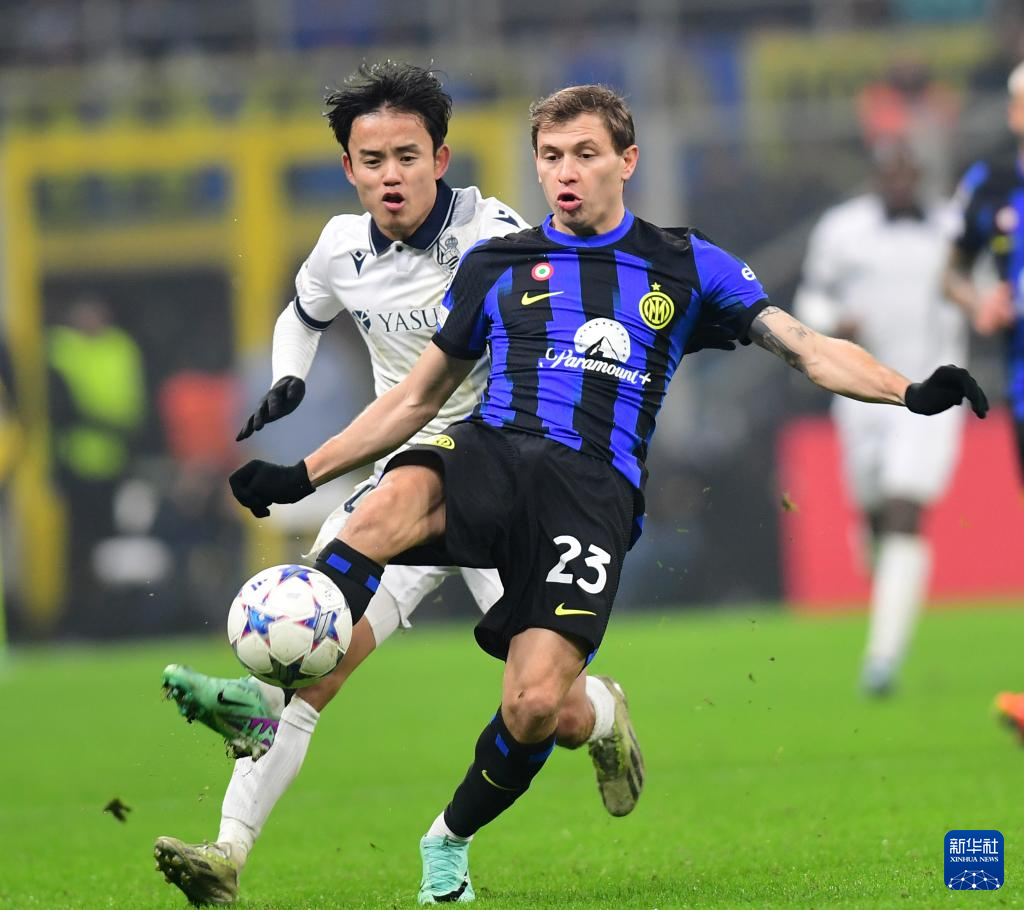 12月12日,国际米兰队球员巴雷拉(右)与皇家社会队球员久保建英在比赛中拼抢。新华社发(奥古斯托·卡萨索利摄)
