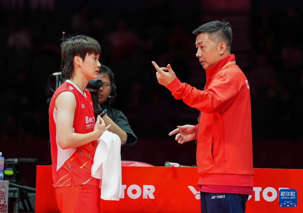 12月14日,陈雨菲(左)在比赛间隙接受教练罗毅刚指导。新华社记者 孙非 摄
