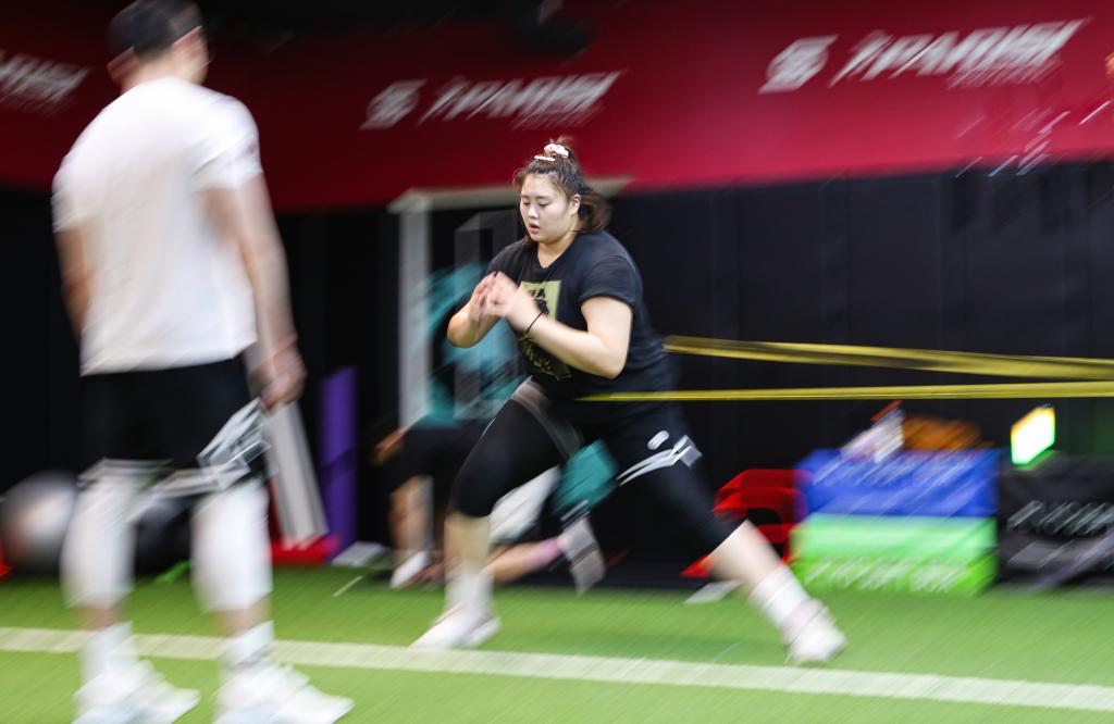 5月12日,在北京市一处健身房内,北京师范大学女篮队员刘禹彤进行体能训练。新华社记者 王婧嫱 摄