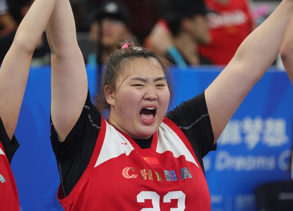 8月5日,中国队球员刘禹彤在成都大运会女篮决赛后庆祝。新华社记者 杨青 摄