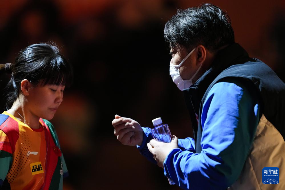 12月15日,教练孙逊(右)在比赛间隙指导陈幸同。新华社记者 张笑宇 摄
