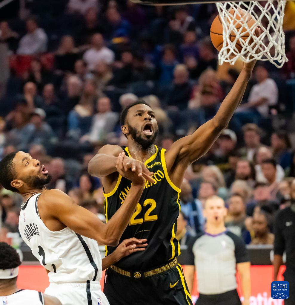 12月16日,勇士队球员维金斯(右)在比赛中上篮。新华社发(董旭东摄)