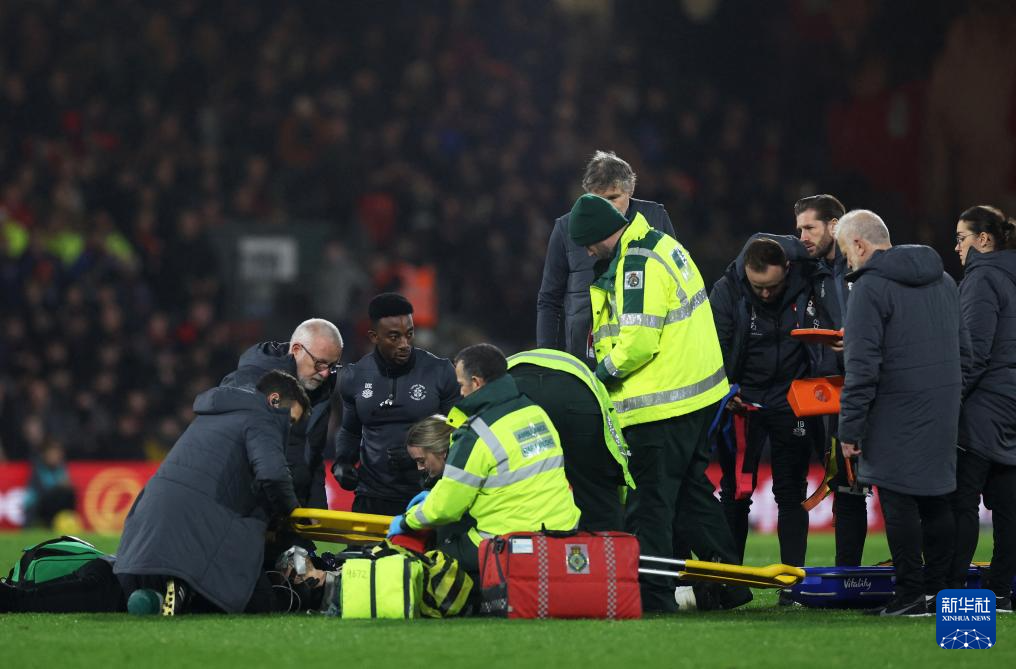 12月16日,卢顿队长洛克伊尔在比赛中突然倒地后接受医疗救援。新华社/路透