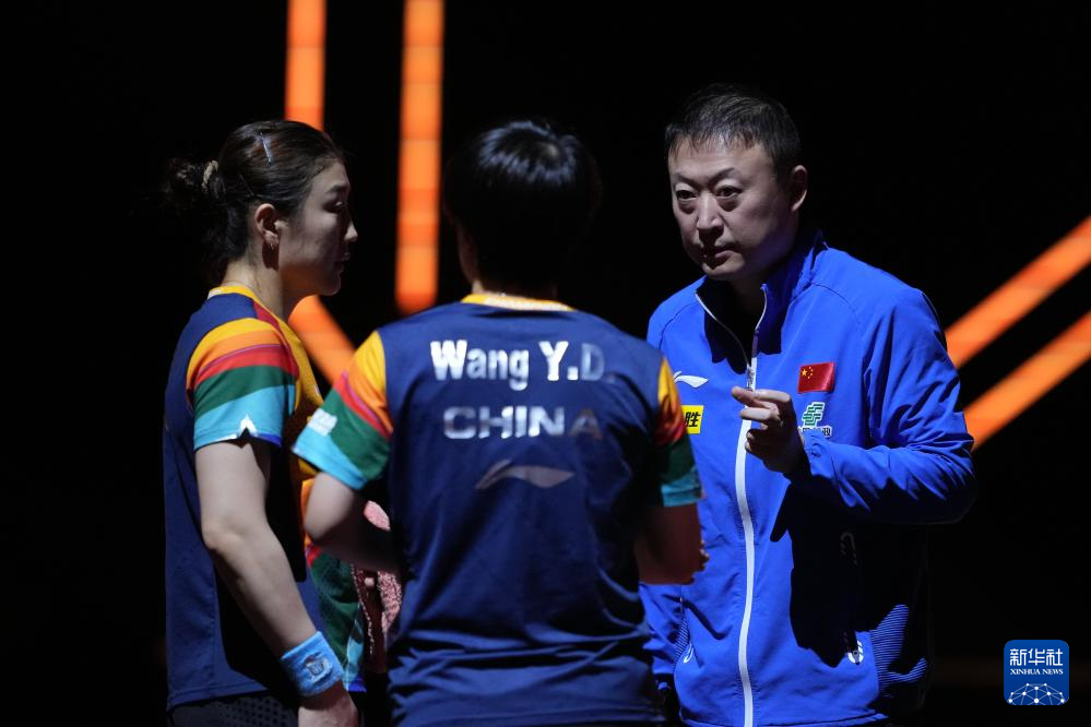 12月16日,教练马琳(右)在比赛间隙与陈梦(左)和王艺迪交流。新华社记者 张笑宇 摄