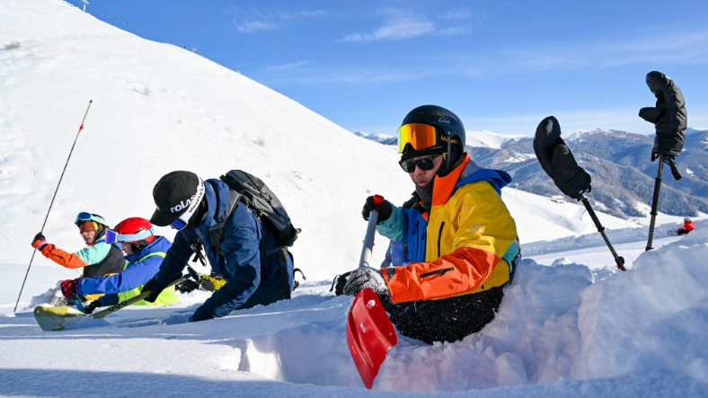 资料图:滑雪爱好者彭超(右)在新疆阿勒泰地区禾木吉克普林滑雪场带领雪友一起做雪层分析。新华社记者 胡虎虎 摄