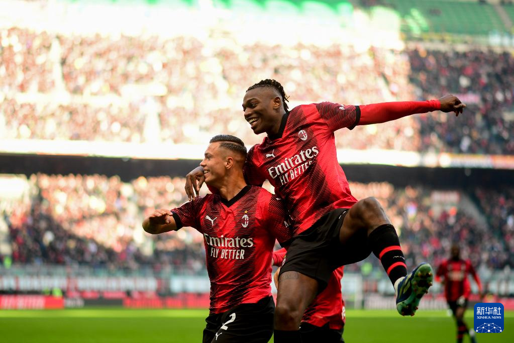 12月17日,AC米兰队球员西米奇(左)与队友莱奥在比赛中庆祝进球。新华社发(阿尔贝托·林格利亚摄)