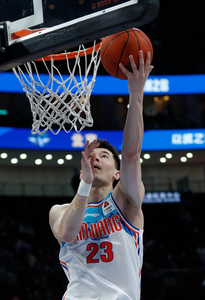 12月17日,新疆队球员阿不都沙拉木在比赛中上篮。新华社记者雒圆摄