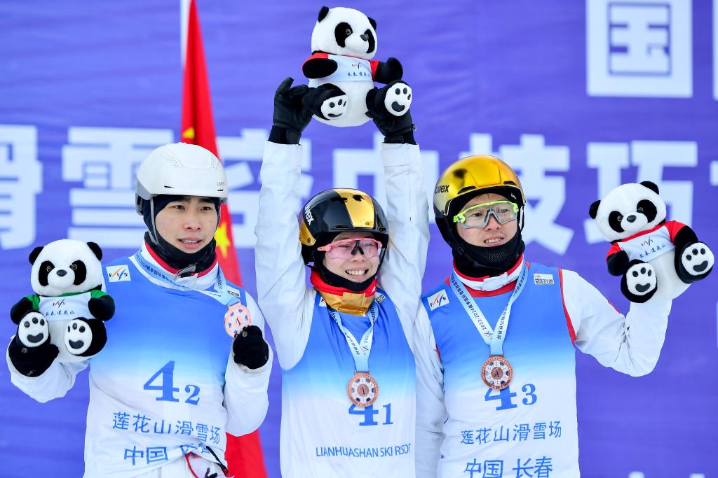 12月17日,获得季军的中国一队选手孔凡钰(中)、张一帆(左)和齐广璞在颁奖仪式上。新华社记者许畅摄