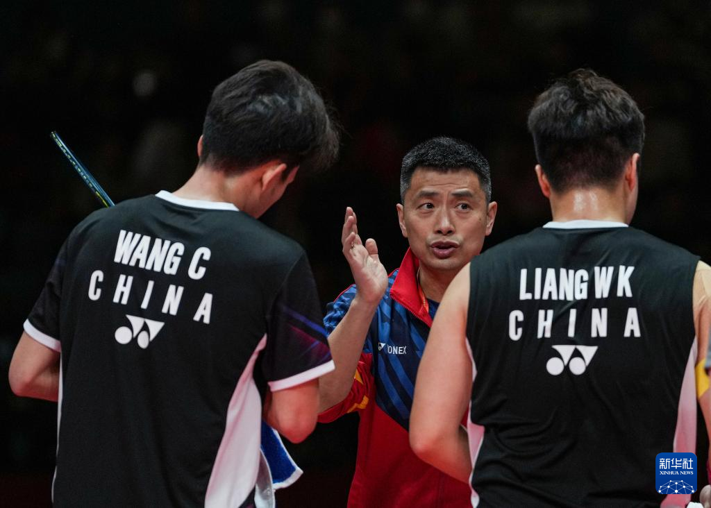 12月17日,梁伟铿(右)/王昶在比赛中接受教练指导。新华社记者 孙非 摄