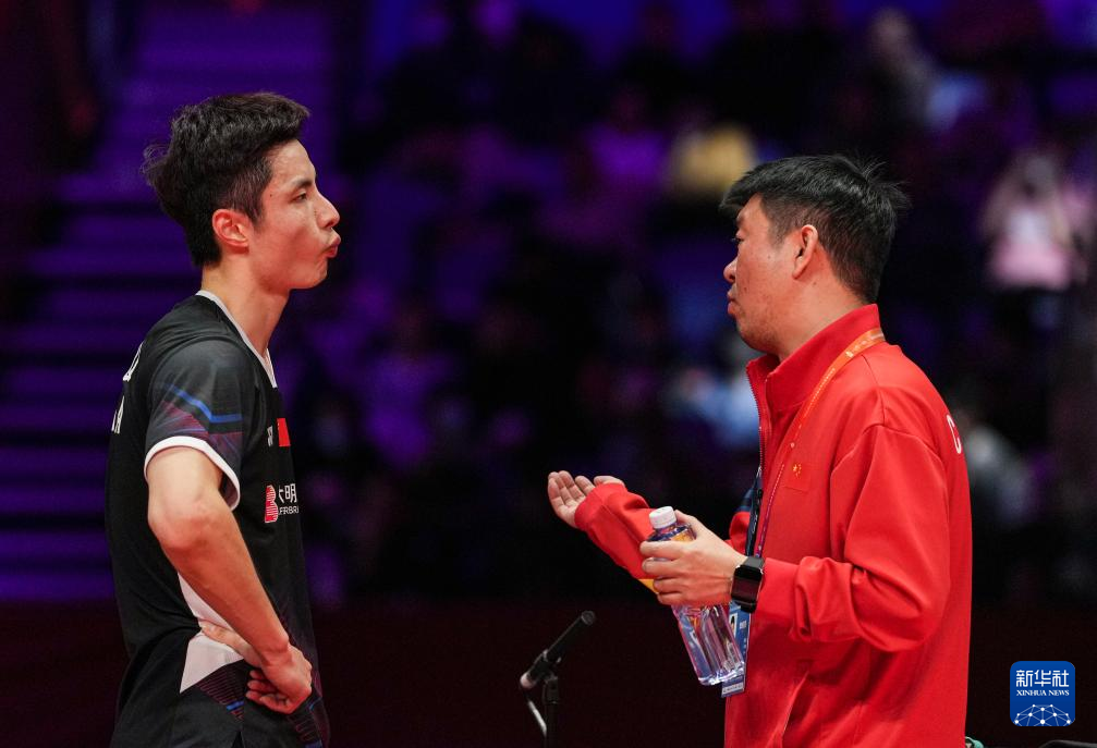 12月17日,石宇奇(左)在比赛间隙接受教练孙俊指导。新华社记者 孙非 摄