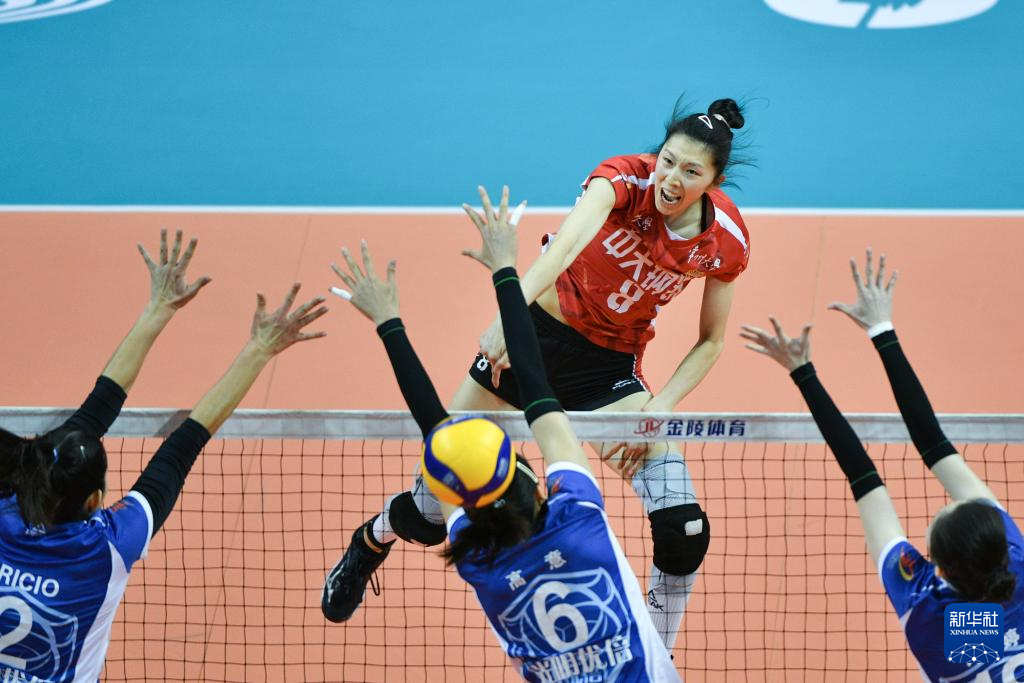 12月19日,江苏中天钢铁队球员吴梦洁(上)在比赛中扣球。新华社发(约阿希姆·毕瓦勒兹摄)