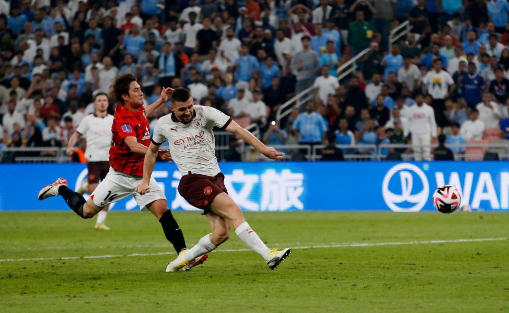 12月19日,曼城队球员科瓦西奇(右)射门得分。当日,在沙特阿拉伯吉达举行的2023年国际足联世俱杯半决赛中,欧冠冠军曼城队3:0战胜亚冠冠军浦和红钻队,晋级决赛。新华社/路透