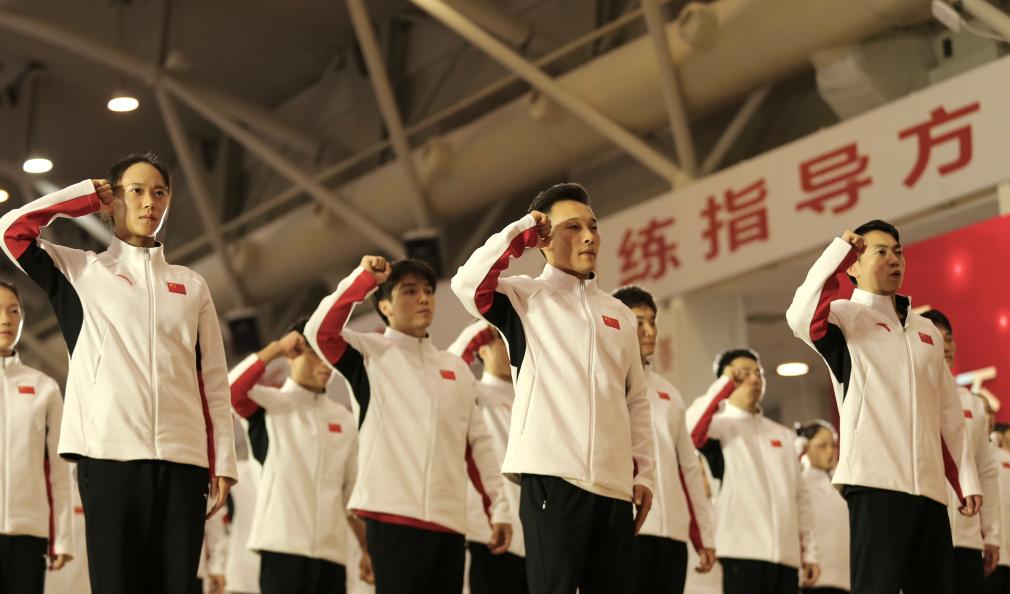 11月17日,中国蹦床运动员朱雪莹、中国体操运动员肖若腾、邹敬园(前排由左至右)在冬训宣誓中。新华社记者 许雅楠 摄