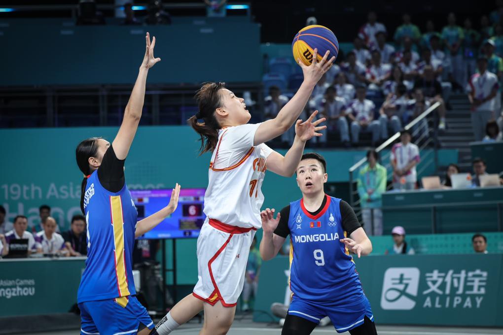 10月1日,中国队球员王馨雨(中)在杭州亚运会三人篮球项目女子U23金牌决赛中上篮。新华社记者 潘昱龙 摄