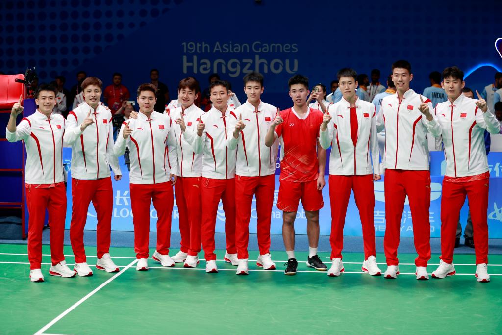10月1日,中国队在杭州亚运会羽毛球男子团体决赛获胜后合影。新华社记者 任正来 摄