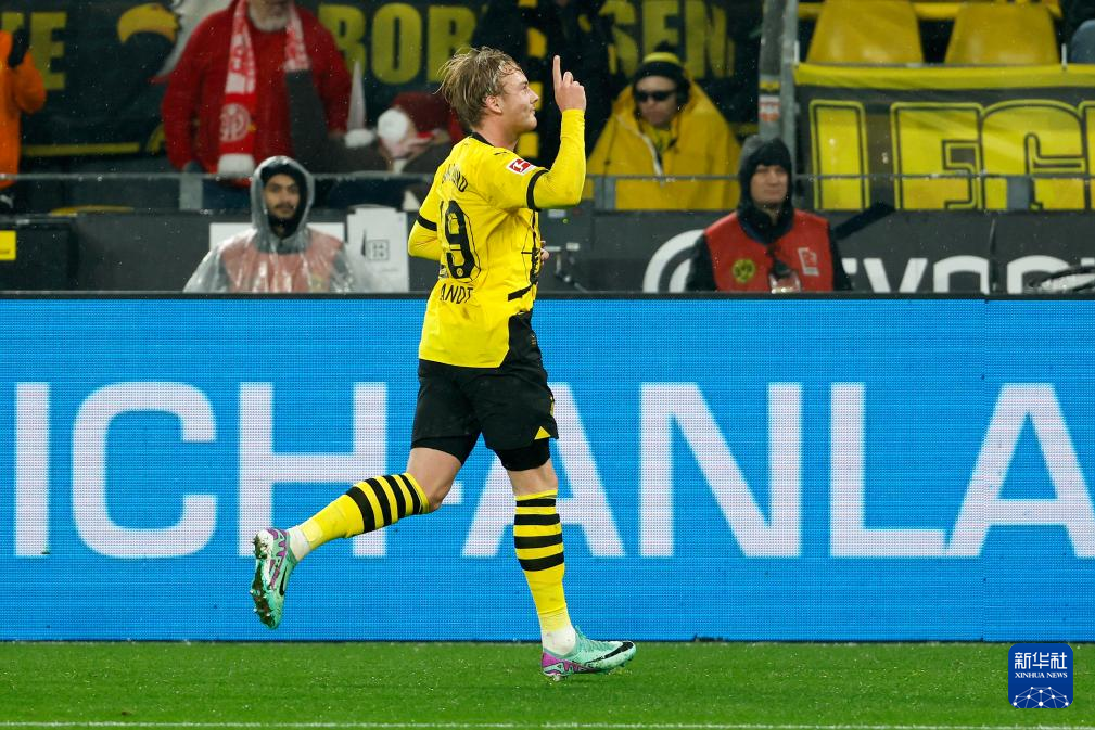 12月19日,多特蒙德队球员勃兰特庆祝进球。新华社发(约阿希姆·毕瓦勒兹摄)