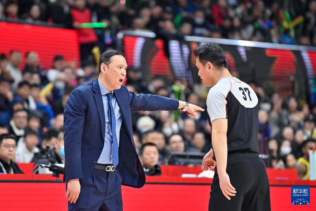 12月20日,四川金强队球员主教练张德贵(左)在比赛中与裁判交流。新华社记者 颜麟蕴 摄