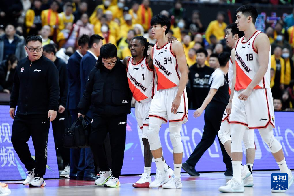 12月22日,江苏肯帝亚队球员莱利(中)在比赛中受伤离场。新华社记者 许畅 摄